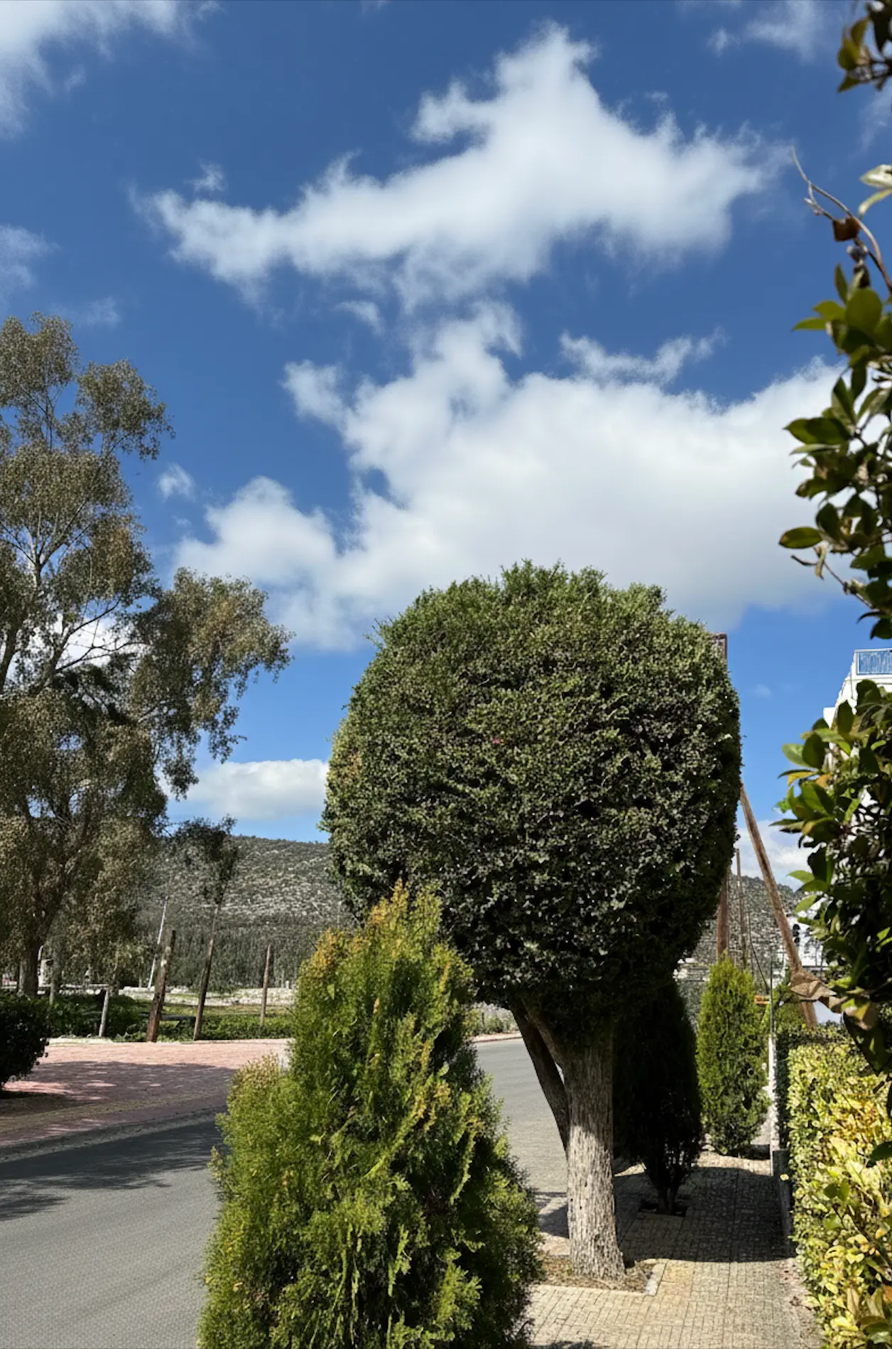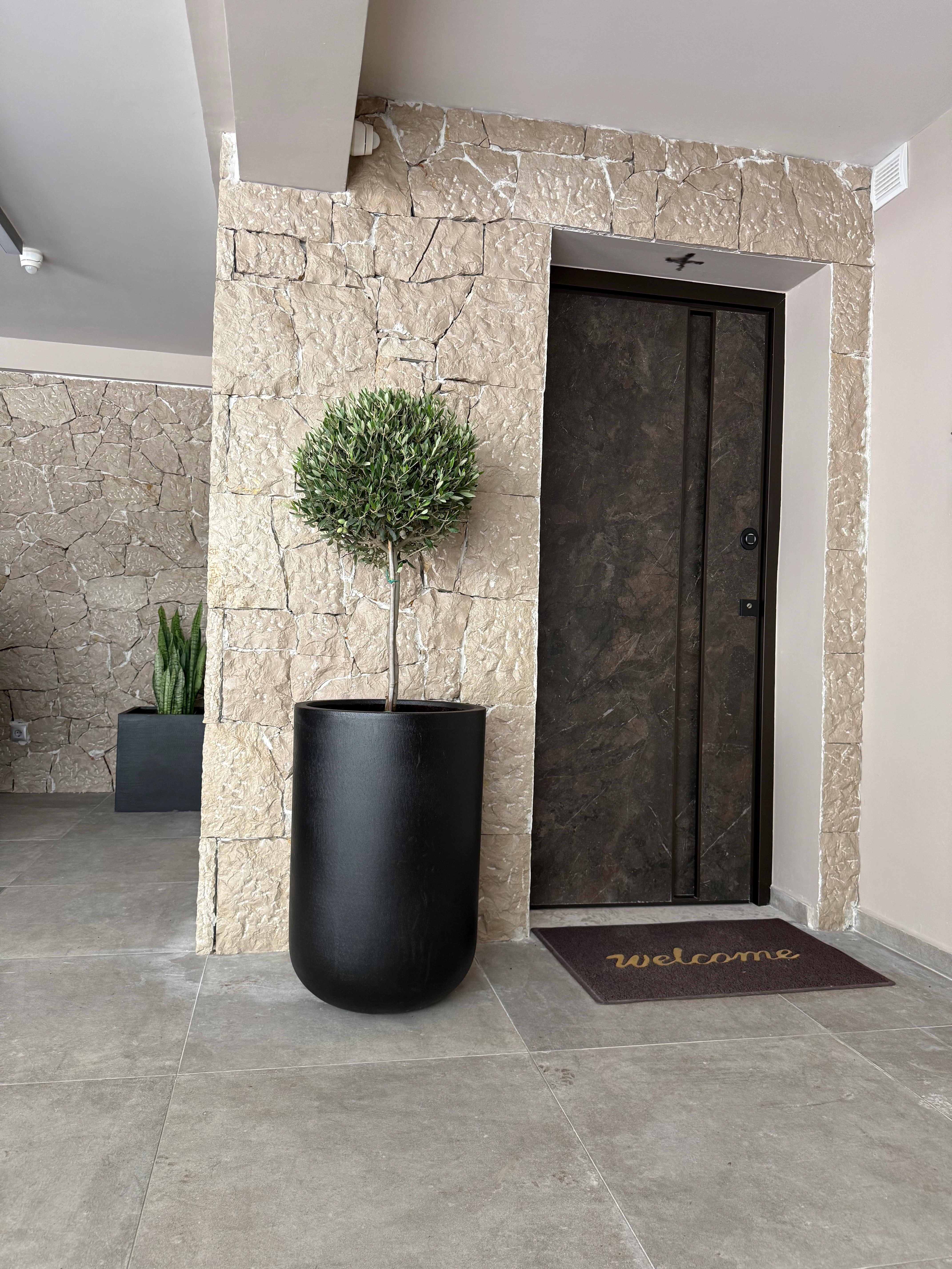 Ένα άψογα διαμορφωμένο δέντρο σε γεωμετρική μορφή που λειτουργεί ως ζωντανό γλυπτό και δίνει μοναδική ταυτότητα στην είσοδο του χώρου.