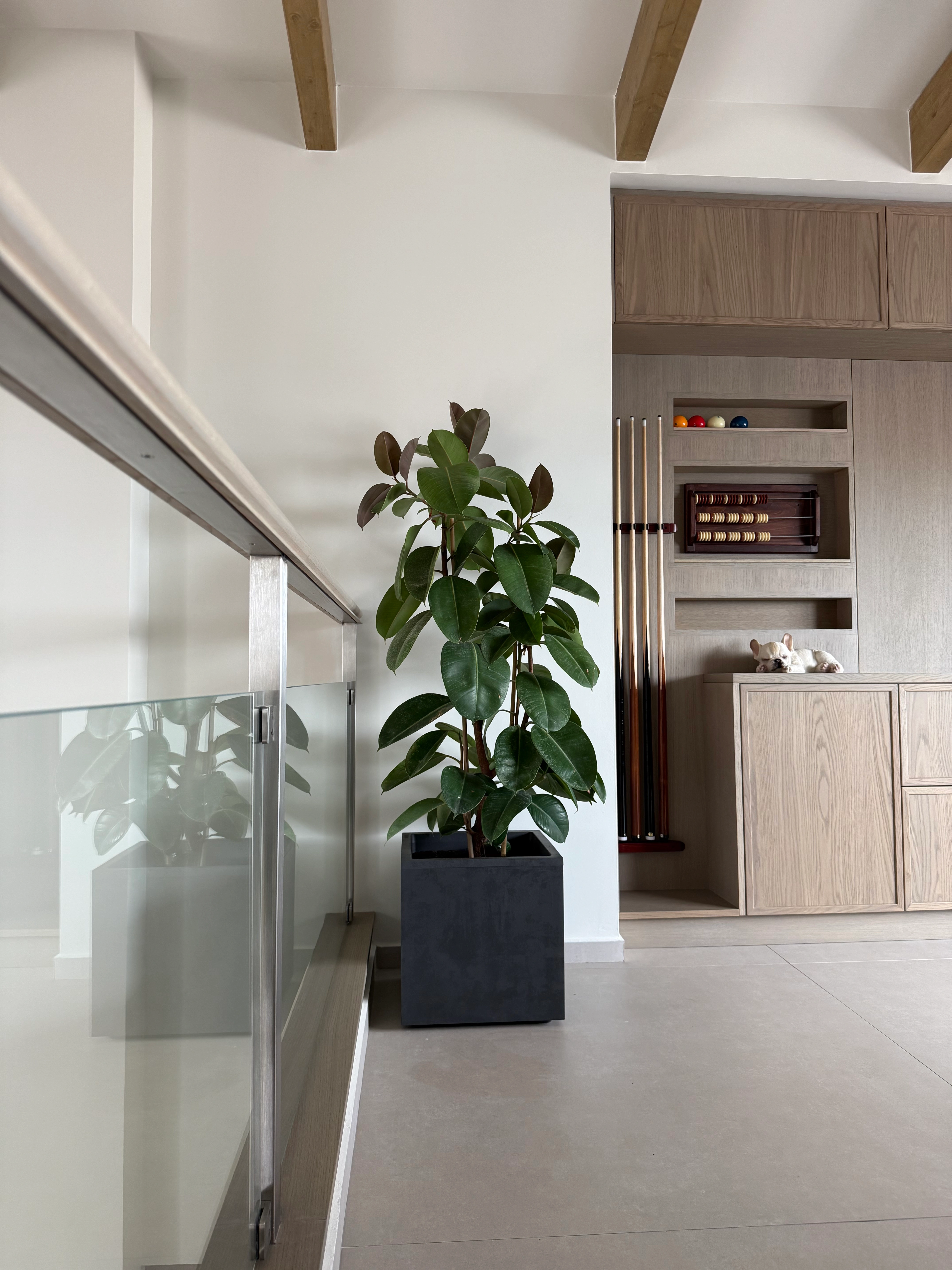 Καθαρή, μινιμαλιστική σύνθεση με φυτά εσωτερικού χώρου που ζωντανεύουν το περιβάλλον και δίνουν ισορροπία στο σύγχρονο design.