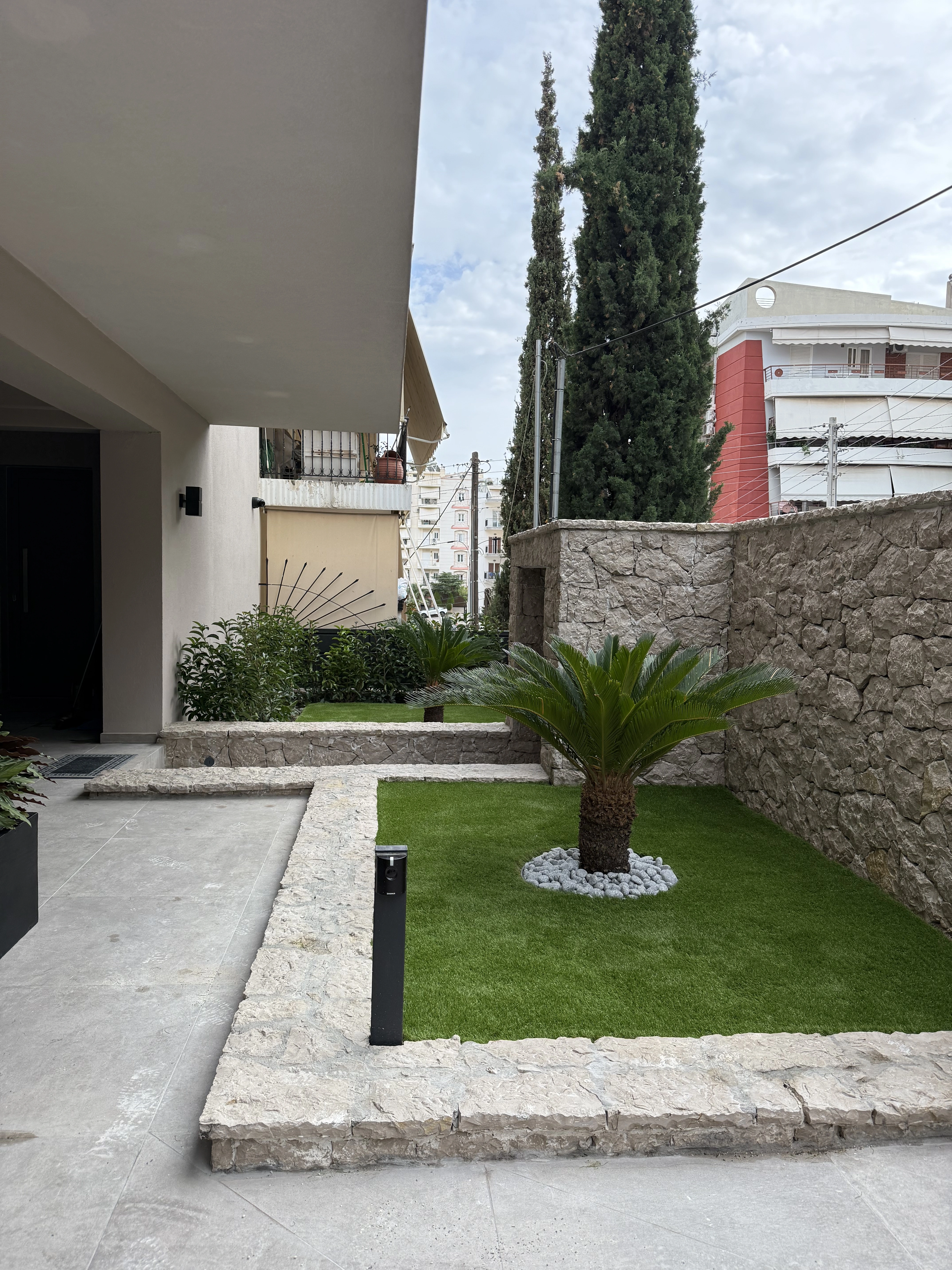 Καθαρή γεωμετρία με ανάγλυφες δενδροφυτεύσεις και μεσογειακά στοιχεία, δημιουργώντας έναν ήρεμο και μοντέρνο εξωτερικό χώρο.