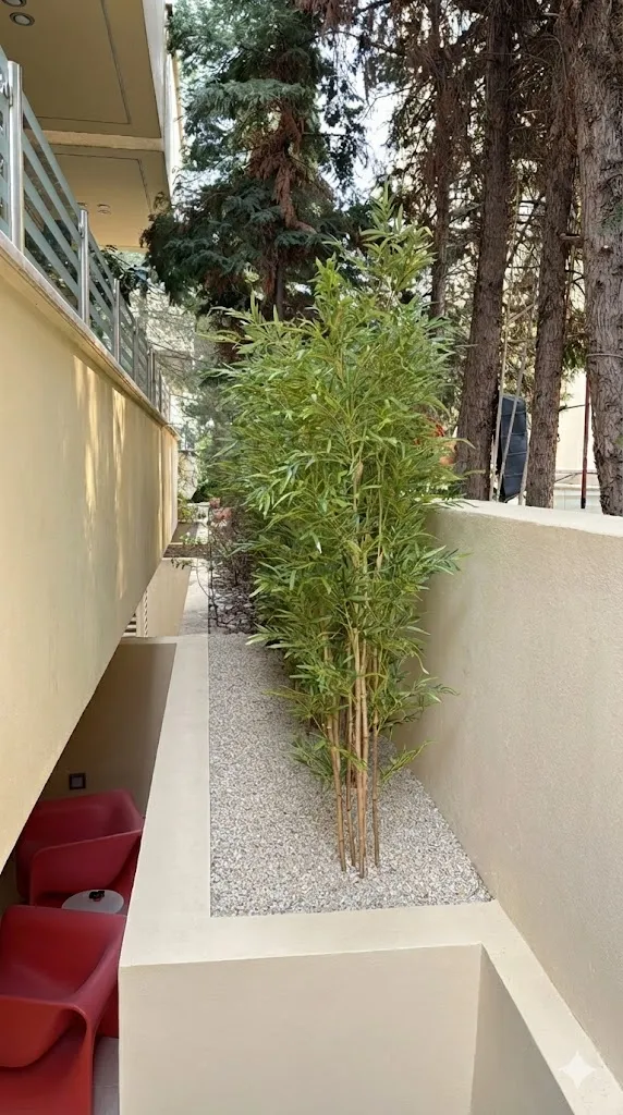 Minimal σύνθεση με real-look τεχνητό μπαμπού και λευκό χαλίκι. Προσφέρει σταθερή αισθητική, ιδιωτικότητα και εξωτική ατμόσφαιρα χωρίς συντήρηση.