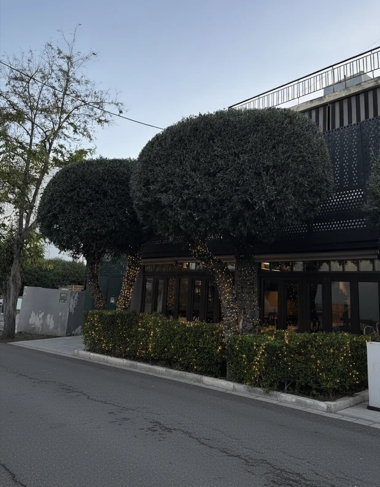 Ένας προσεγμένος κήπος που αναδεικνύει την πρόσοψη του εστιατορίου με μεγάλες, διαμορφωμένες δεντροστοιχίες και χαμηλούς φράχτες.
