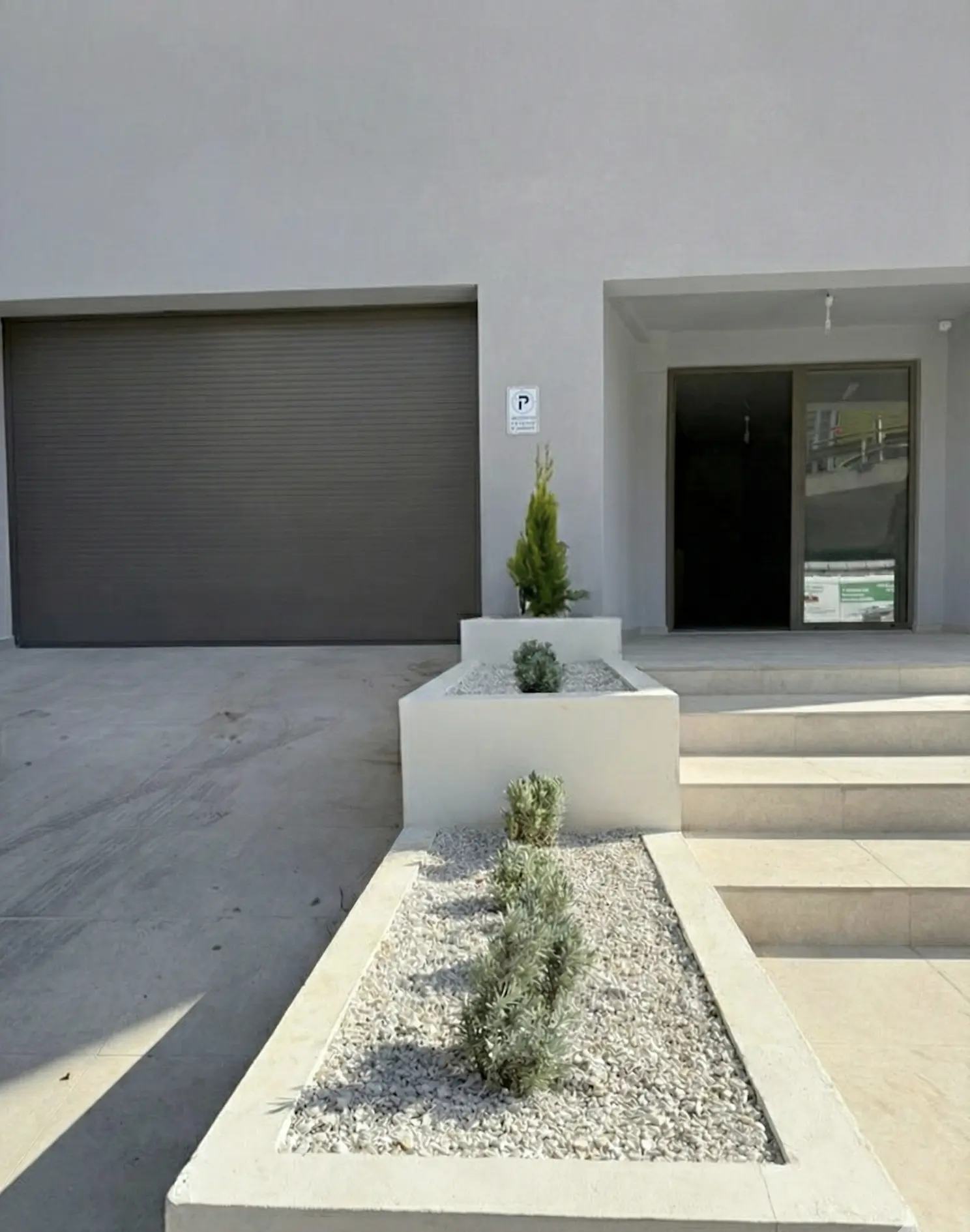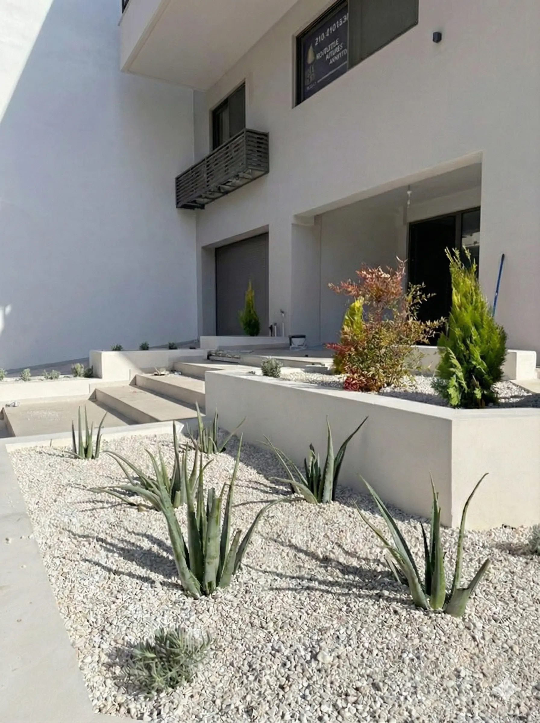 Διαδοχικά planter boxes με μεσογειακά φυτά, που καθοδηγούν την κίνηση προς την είσοδο και αναδεικνύουν την αρχιτεκτονική του κτιρίου.