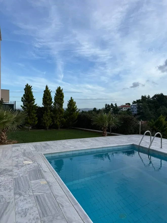 Ένας κομψά διαμορφωμένος κήπος που αγκαλιάζει την πισίνα και δημιουργεί μια μικρή ιδιωτική όαση.