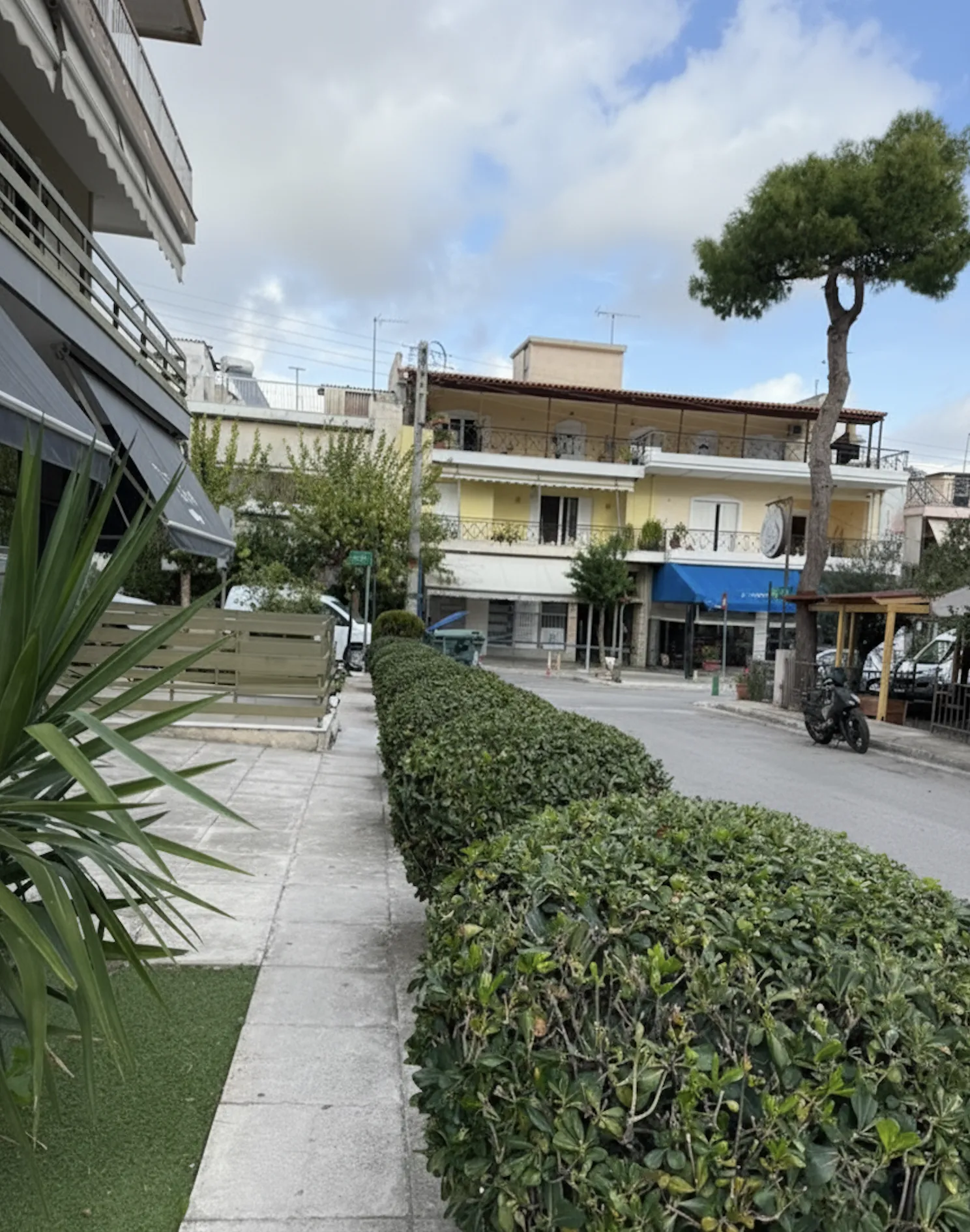 Συνεχής γραμμή θάμνων που ορίζει τη διαδρομή και προσθέτει πράσινη συνοχή στον αστικό χώρο, δημιουργώντας ένα ήρεμο και οργανωμένο περιβάλλον.